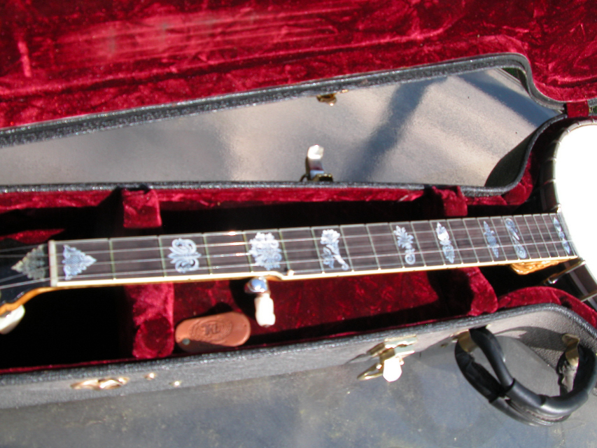 and heel carving by Glenn Carson. Remo plastic head with ProBlock coating outside. Modern five string Presto tailpiece with prewar