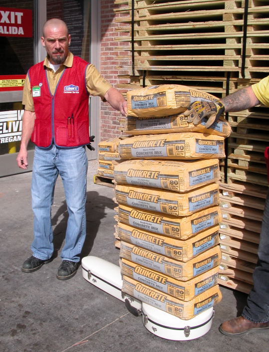 put on, the case was taken to Lowe's in Midwest City OK where some younger and stronger fellows, Mike, Mark and Karl, stacked 10 80 pound sacks of Sakcrete on top.